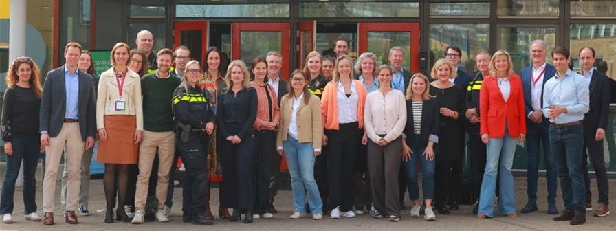 Faten (links) met andere bankmedewerkers en politie bij de opening van Bank voor de Klas.